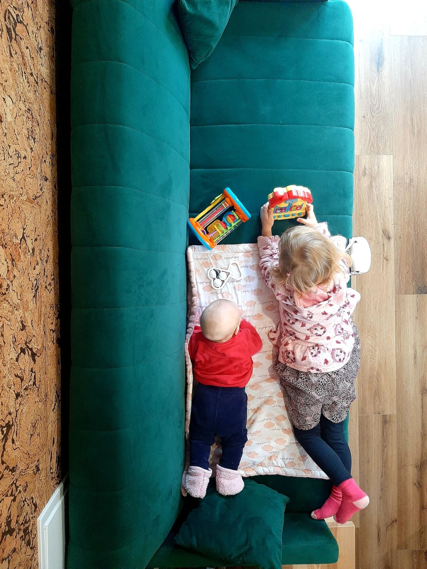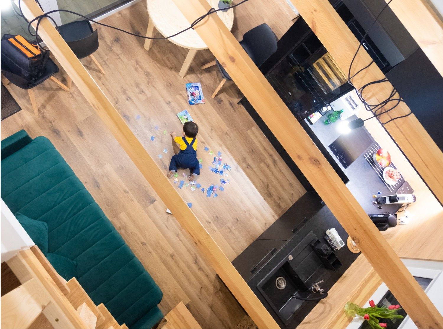 Nasi Goście znajdą tu również udogodnienia dla swoich pociech – kubeczki, miseczki, talerzyki i sztućce do spożywania posiłków przez najmłodszych, książeczki z bajkami i wierszykami oraz zabawki (znajdziecie je w skrzyni w szafce na piętrze).