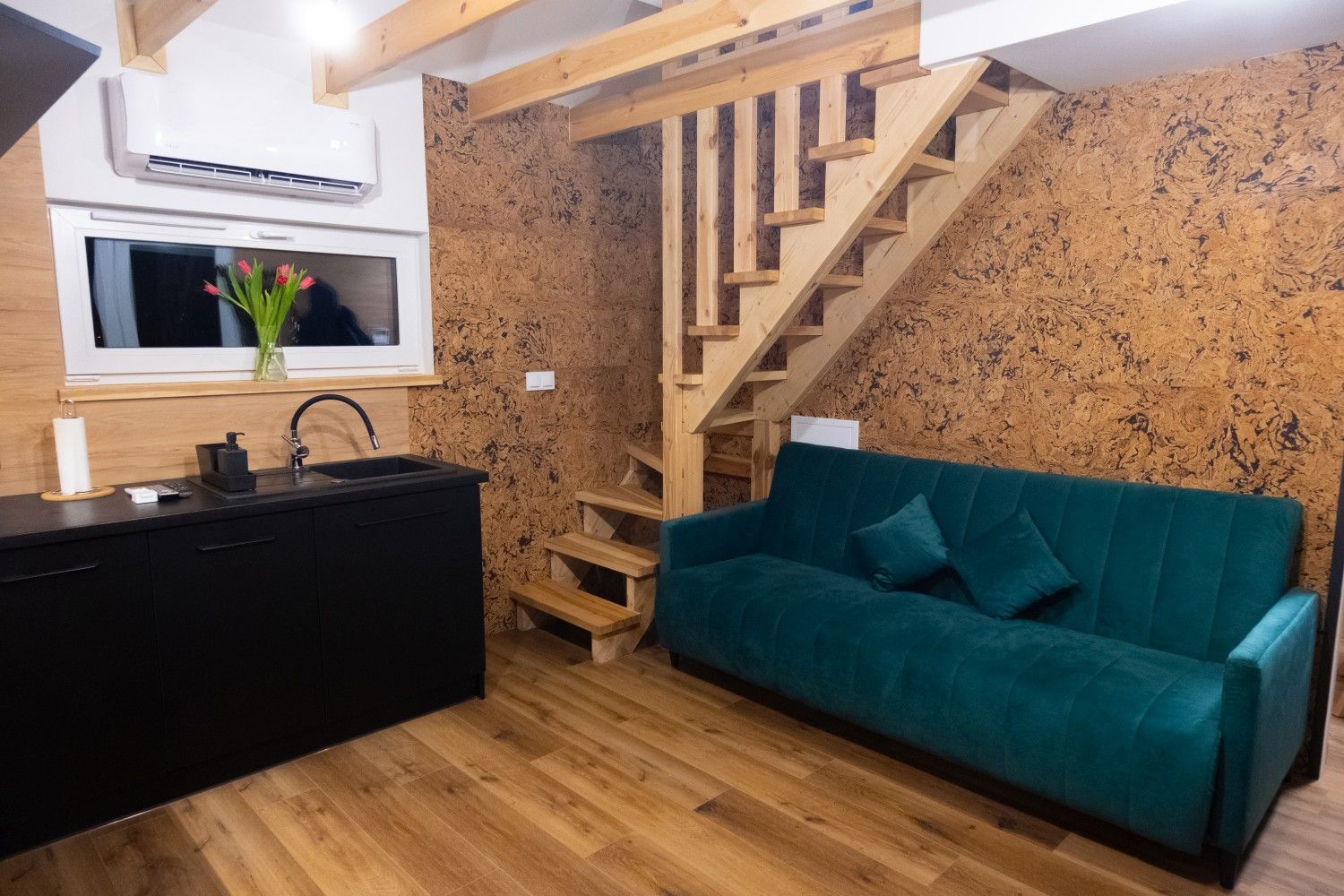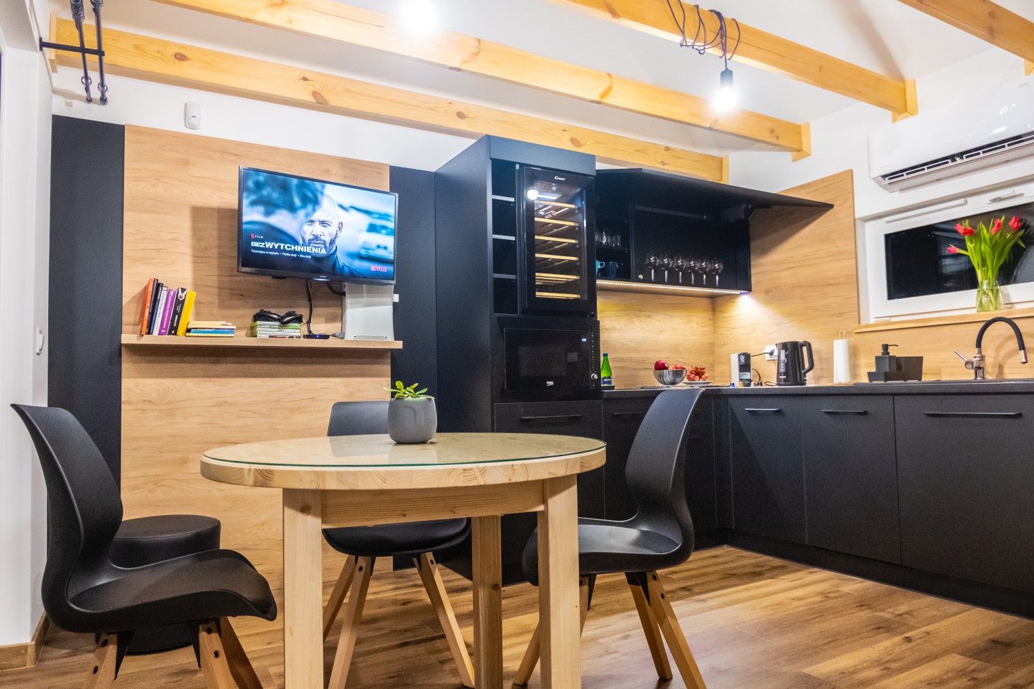 Domek jest w pełni wyposażony i przygotowany do przyjęcia 4 osób. Domek posiada dwie sypialnie (jedna na parterze, druga na antresoli) - w każdej dwuosobowe łóżko z wygodnym materacem i kompletem pościeli. Salon z kuchnią i jadalnią pozwala na w pełni samodzielne przygotowanie posiłków. Wieczorami, kiedy po aktywnym dniu na szlakach będziecie chcieli poleniuchować, w salonie znajdziecie tv z dostępem do serwisów streamingowych i telewizji kablowej, konsolę Xbox 360, gry planszowe oraz kilka książek - jeśli wolicie spędzić czas na czytaniu.