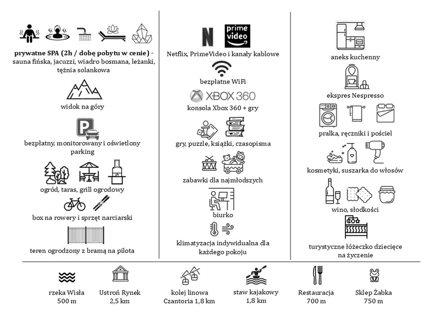 Z salonu możecie wyjść na taras z pięknym widokiem na górę Równicę. Indywidualny, wydzielony ogród sprzyja zabawom i odpoczynkowi. Odpowiednia odległość od centrum miasta (ok 1,5 km) oraz bliskość rzeki Wisły, szlaków i stoków pozwala wypocząć na łonie natury i sprzyja pieszym wędrówkom i spacerom. Goście mogą zaparkować na bezpłatnym, monitorowanym i oświetlonym parkingu.